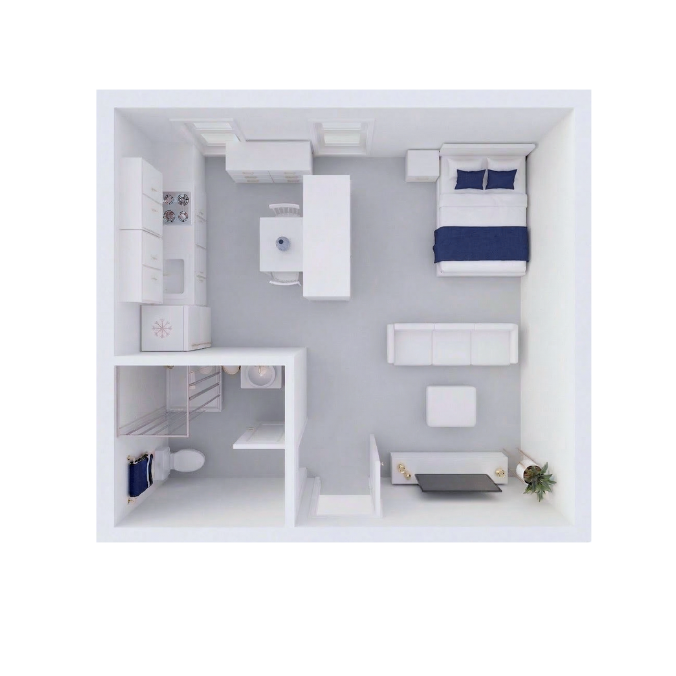 Roomier 306-357 sq ft studio, fully furnished. Desk, storage, full appliances. Walk to classes, fitness room on-site. Utilities covered—perfect balance of size and price for sophomores/juniors